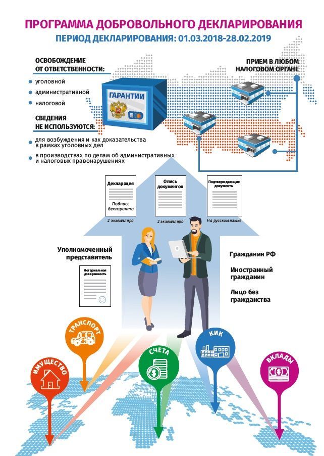 С 1 марта 2018 года по 28 февраля 2019 года в соответствии с Федеральным законом от 8 июня 2015г. № 140-ФЗ «О добровольном декларировании физическими лицами активов и счетов (вкладов) в банках и о внесении изменений в отдельные законодательные акты Российской Федерации» Вы можете сообщить о своих зарубежных активах и счетах в налоговый орган по месту жительства или в ФНС России.