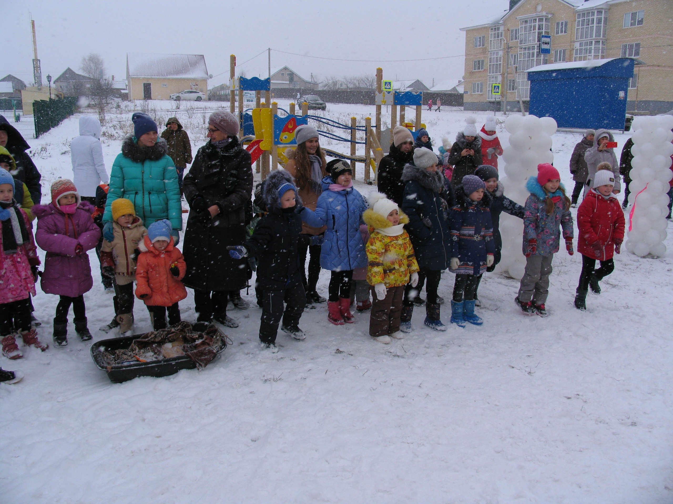 На открытие площадки у детсада "Пчелка" пришло много детишек, которые с удовольствием катались на горках и лазили по лестницам.