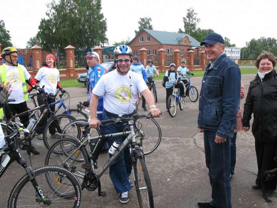 Перед тем, как отправиться по маршруту в Болгар, участники в сопровождении юных велосипедистов проехались по улицам поселка, отметив их чистоту и ухоженность.