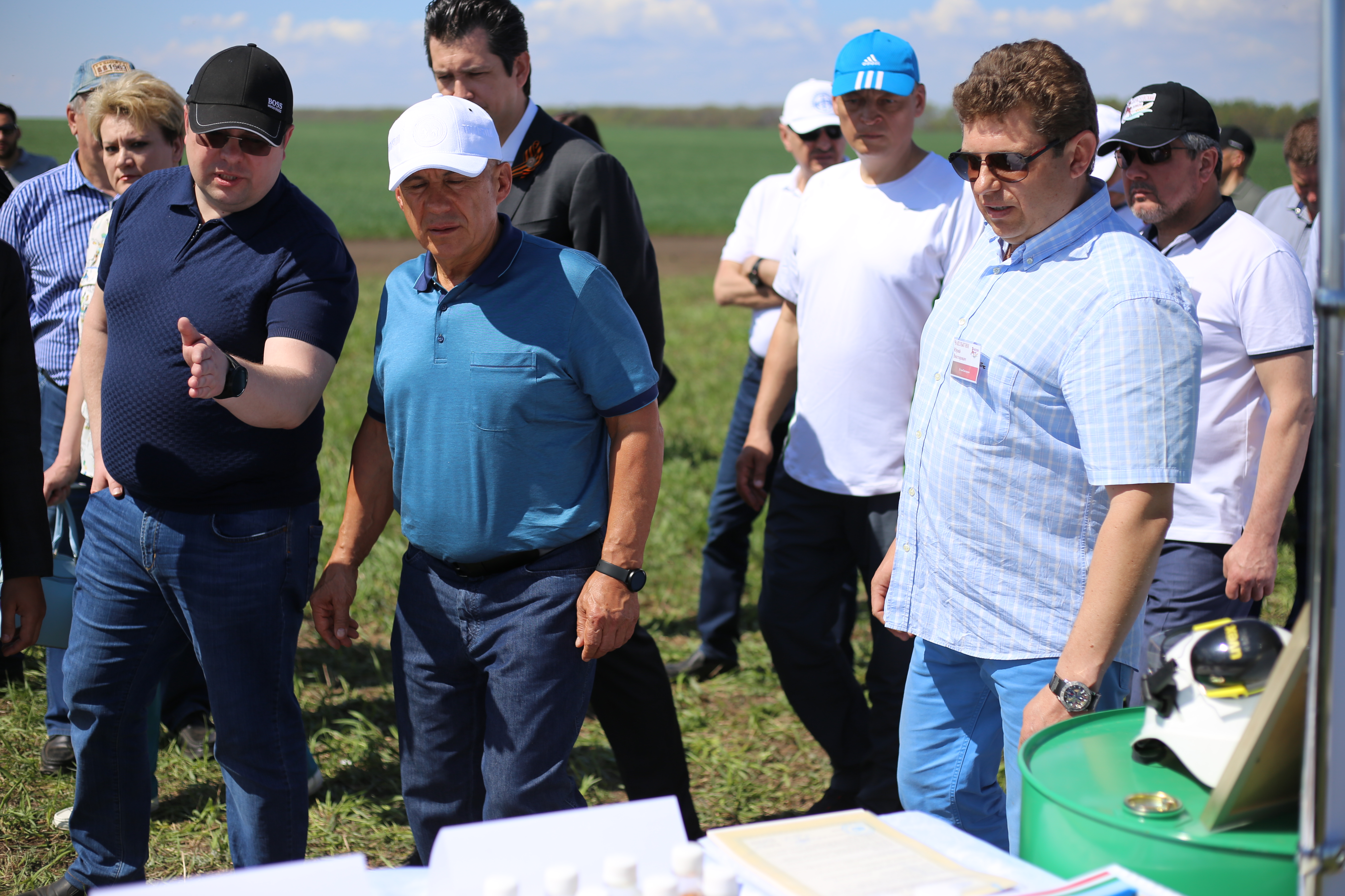 Президент Республики Татарстан Рустам Минниханов сегодня посетил Алексеевский район с рабочим визитом. После облёта полей Президент встретился с Главой района Сергеем Демидовым, инвесторами, руководителями хозяйств и предприятий, главами сельских поселений Алексеевского муниципального района. В ходе рабочей поездки Президента сопровождали первый заместитель председателя комитета Госдумы РФ по аграрным вопросам Айрат Хайруллин, министр сельского хозяйства и продовольствия РТ Марат Ахметов и министр экономики РТ Фарид Абдулганиев. Основная цель поездки - ознакомление с ходом посевных работ. По прибытии Рустам Минниханов ознакомился с выставочными экспозициями КФХ и с продукцией местных товаропроизводителей, а также с проектами резидентов промышленной площадки.