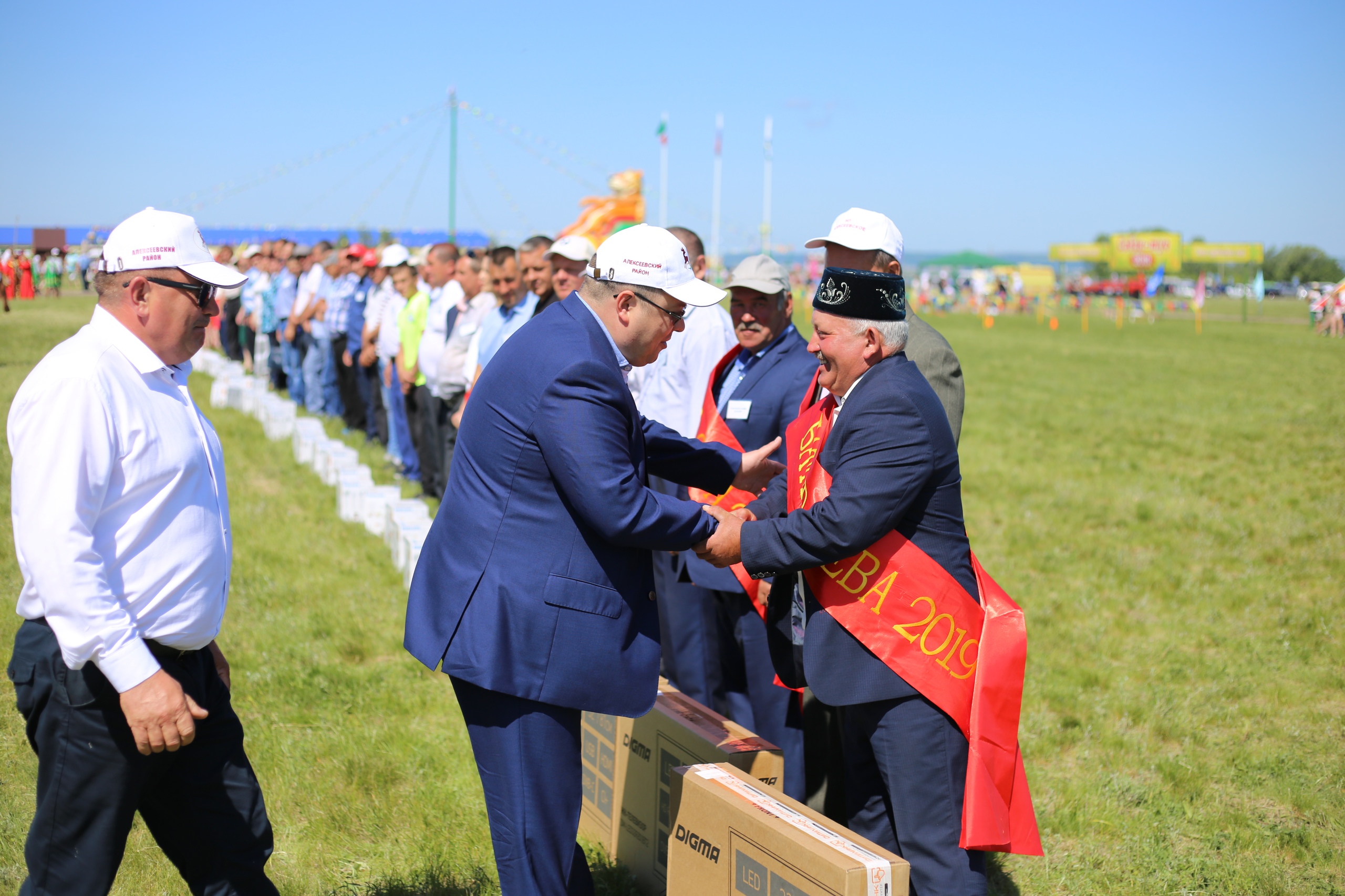 В самом сердце майдана сегодня чествовали передовик сельского хозяйства, чей труд является залогом продовольственной стабильности региона. Так, например, Вячеслав Капралов (НП «Алексеевское») на тракторе «Беларус» на севе яровых культур засеял более 600 га; Альфир ахматваллеев, который трудится на предприятии «ВЗП Северное Алексеевское», засеял 508 га, а площадь боронования составила более 350 га. А Ринат Ситдиков из колхоза «Алга», являясь к тому же делегатом слёта передовиков сельского хозяйства в ходе весенней страды произвёл посев на площади 118 га и культивацию на площади более 365 га. К слову, Ринат Нариманович имеет почётное звание «Заслуженный механизатор сельского хозяйства и продовольствия РТ». Именно им и выпала честь поднять флаги на церемонии открытия Сабантуя. Глава Алексеевского района Сергей Демидов наградил батыров сева, передовиков хозяйств района и механизаторов.