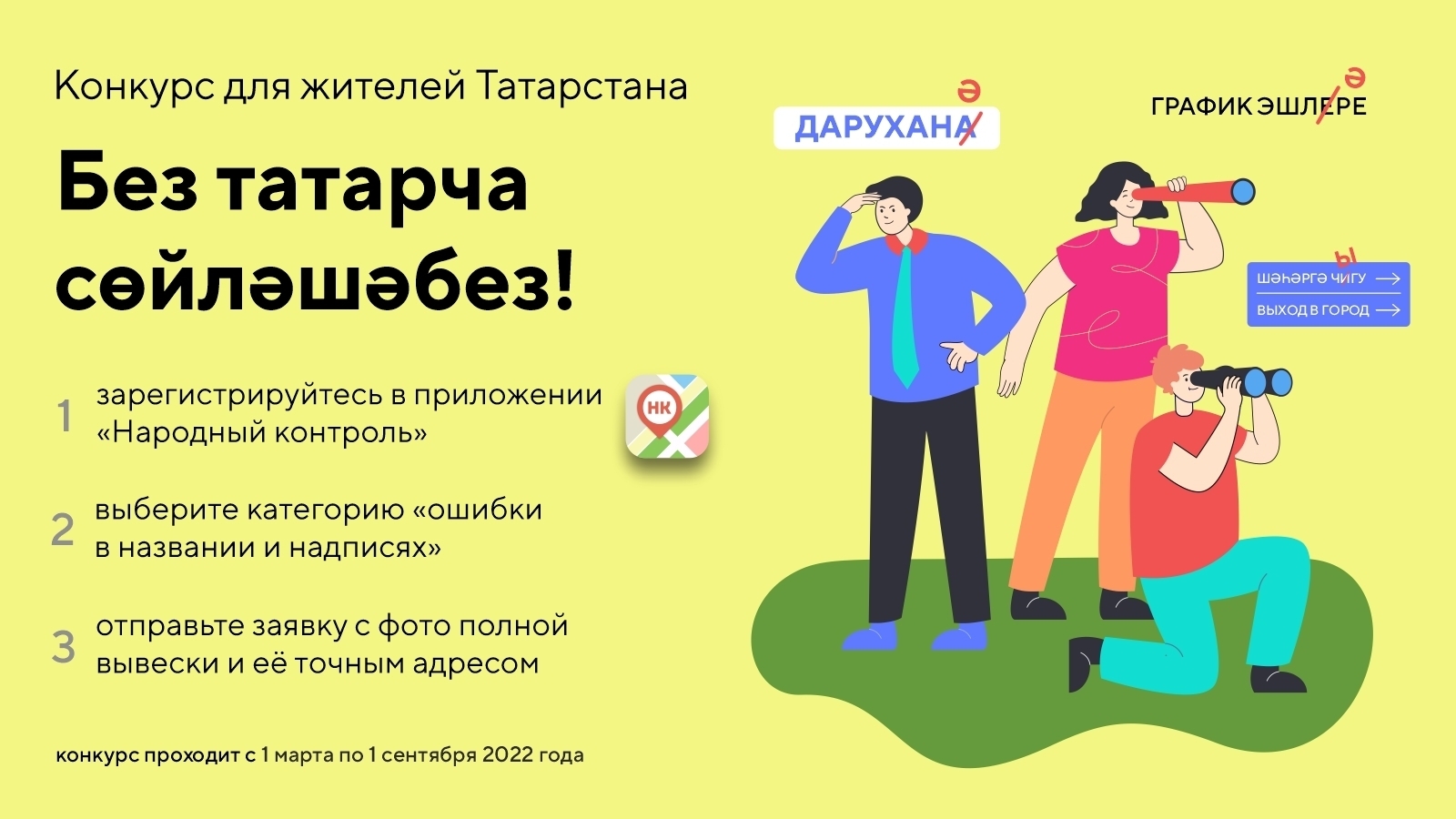В Татарстане с 1 марта по 1 сентября 2022 года проходит конкурс по выявлению ошибок в названиях и надписях на вывесках и информационных табличках на татарском языке.