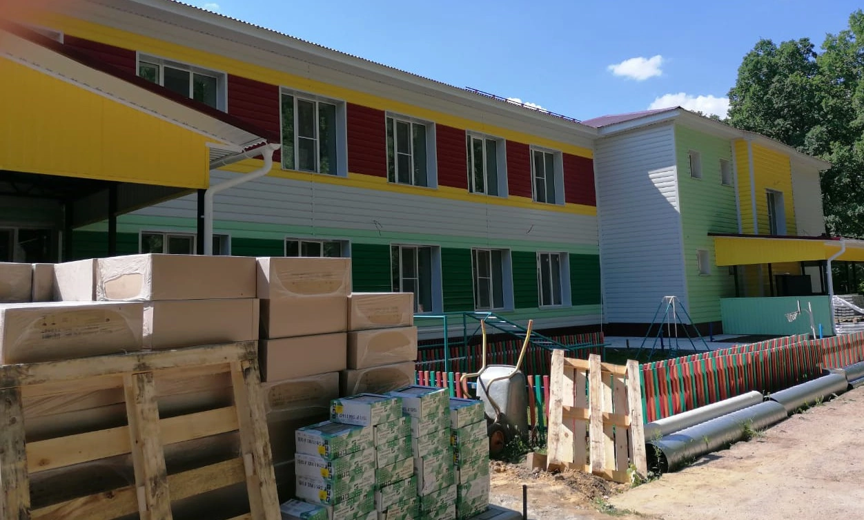 На начало августа стены первого и второго этажа обшиты и сейчас строители крепят потолок. Весь пищеблок отделан плиткой. Везде проведена вентиляция. В ближайшее время будут установлены двери и уложен линолеум. Также ведётся работа по благоустройству территории.