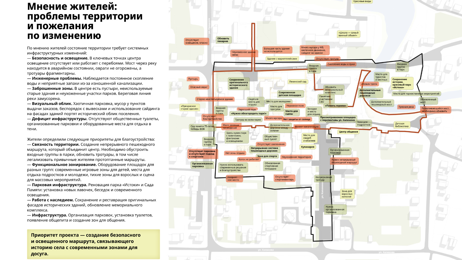 Одновременно участники обозначили ряд проблем. Несмотря на то что центральная территория активно используется жителями, существующие учреждения и общественные объекты не соединены удобными пешеходными маршрутами, часть пространств требует благоустройства, отдельные территории находятся в запущенном состоянии. Также отмечена утрата ранее существовавшего парка и отсутствие оборудованной площадки для проведения массовых мероприятий.