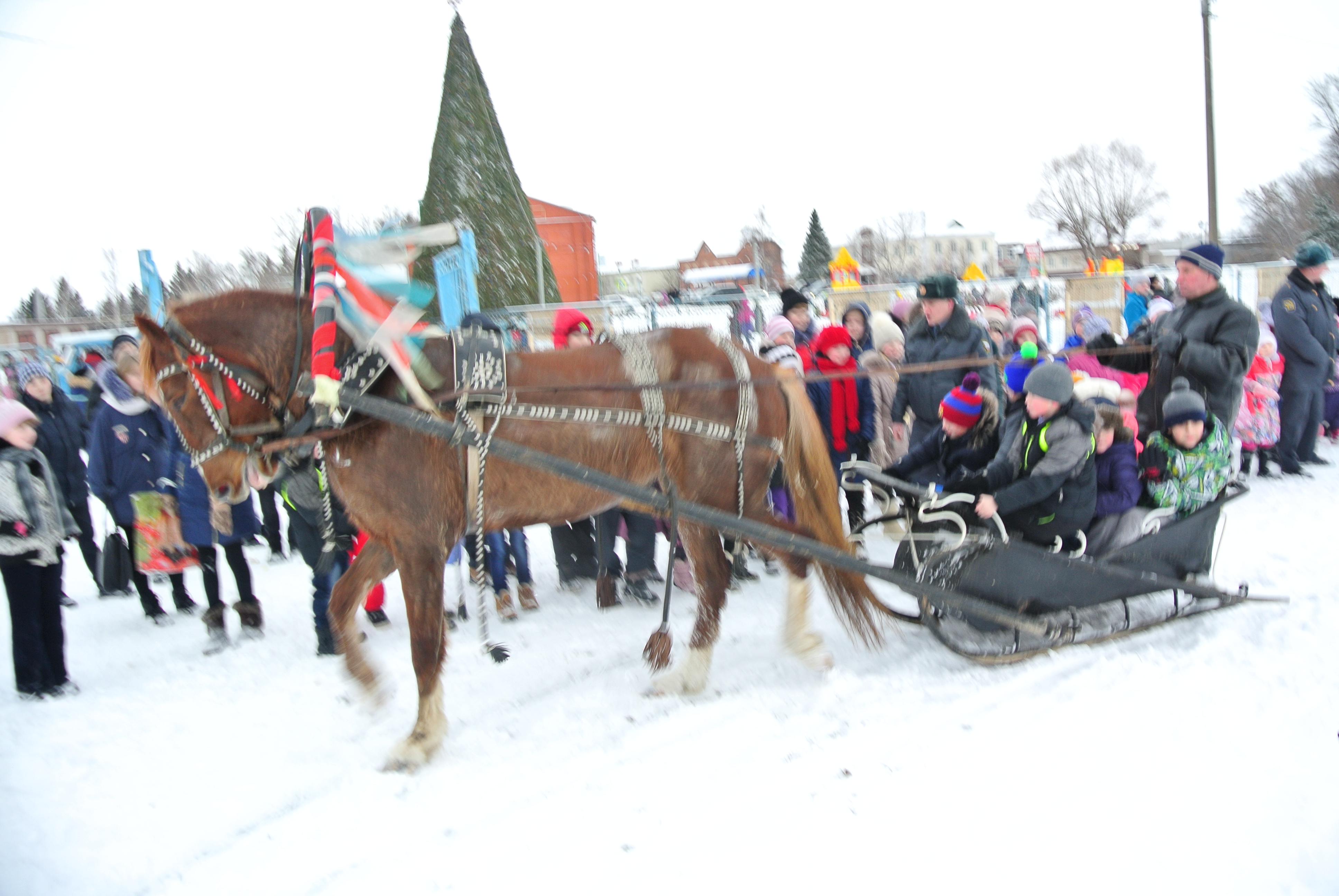 Горячий чай с конфетами, катание на лошадях и снегоходе, недавно установленных каруселях и с горки, а также многочисленные хороводы окунули ребятню в праздничную атмосферу.