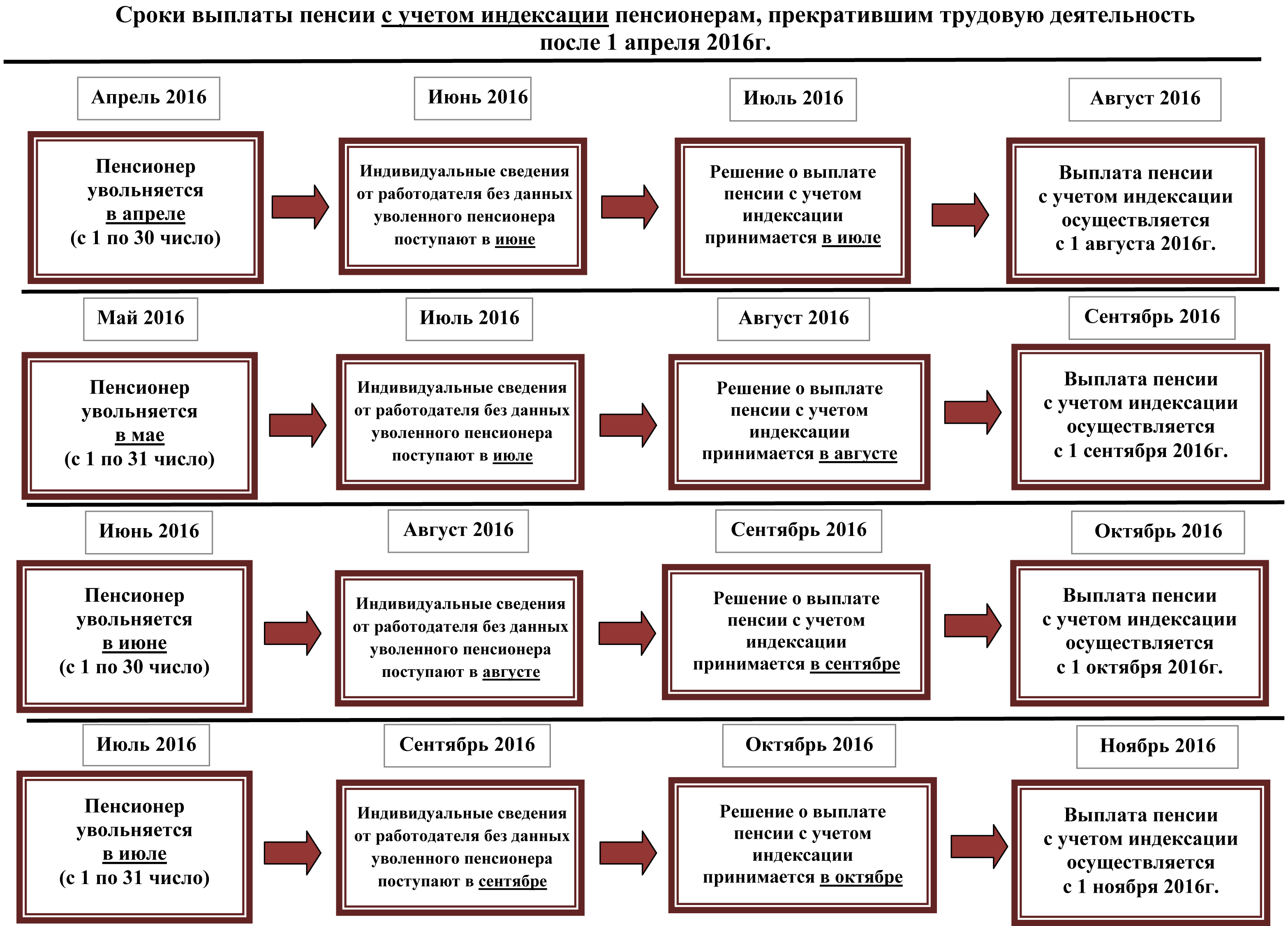 Напоминаем Вам, что выплата страховой пенсии с учетом индексации осуществляется только через три месяца после месяца увольнения*. Например, прекратившим трудовую деятельность в апреле 2016 года пенсия с учетом индексации выплачивается только с 1 августа 2016 года (май, июнь, июль), уволенным в мае 2016 года – начиная с 1 сентября 2016 года (июнь, июль, август) и т.д.