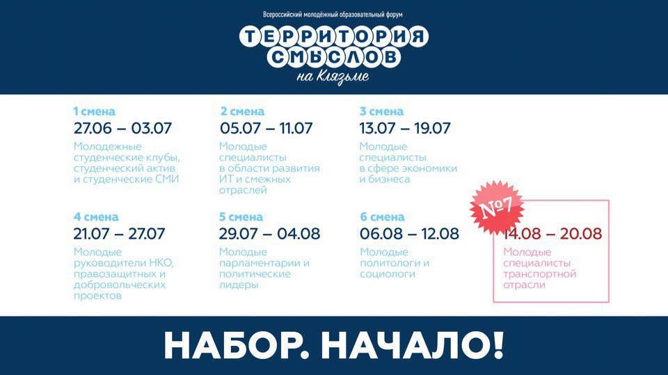«В рамках развития партнёрских отношений с Министерством транспорта России нами было принято совместное решение организовать в рамках форума «Территория смыслов на Клязьме» профильную смену для молодых специалистов в области транспорта», — говорится в сообщении дирекции образовательной площадки.