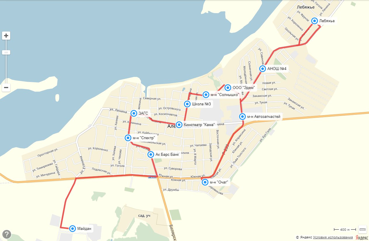 Порядок остановок: м-н "Очаг"; м-н Автозапчастей; АНОШ №4; Лебяжье; ООО "Эдем"; м -н "Солнышко"; Школа №3; Кинотеатр "Кама"; ЗАГС; м-н "Спектр"; Ак Барс Банк; Майдан (смотрите карту).