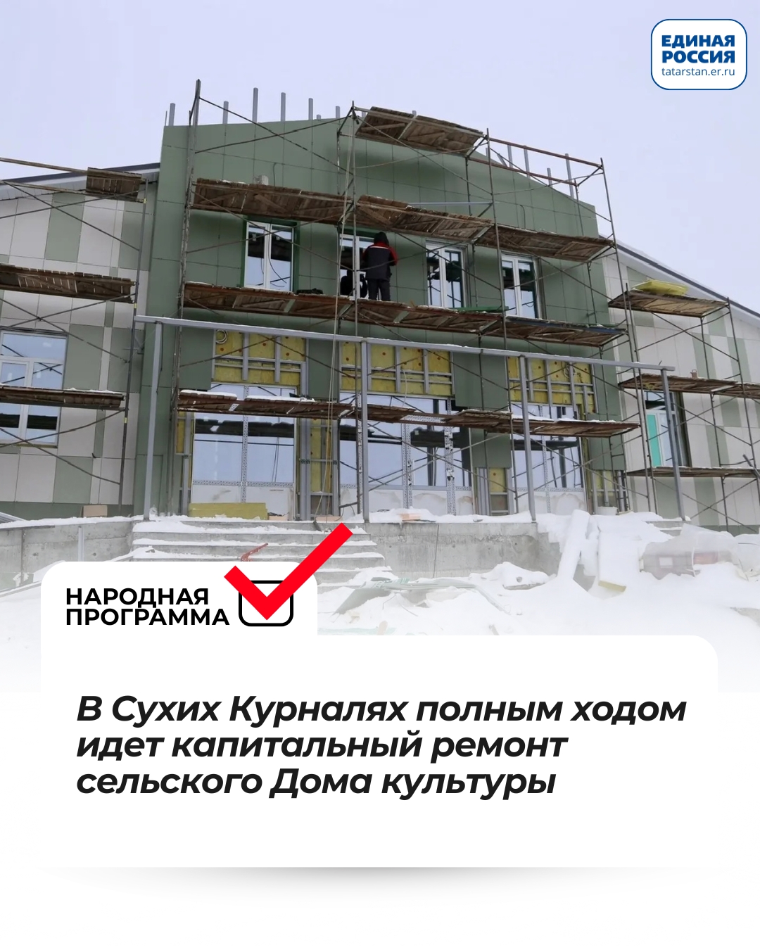 В селе Сухие Курнали Алексеевского района полным ходом идет капитальный ремонт сельского дома культуры Здание дома культуры построено в 1965 году. На сегодня строители завершили демонтажные работы, а также утеплили фасад. Специалисты приступили к отделке помещений .«После завершения ремонта здесь разместятся дом культуры, сельская библиотека, исполком сельского поселения, ФАП. Это позволит объединить сервисы в одном современном и удобном здании. Планируем завершить все работы и открыть объект уже в феврале. Уверен, обновлённый центр станет точкой притяжения для жителей и будет востребован долгие годы», – отметил секретарь местного отделения Партии, Глава района Сергей Демидов.