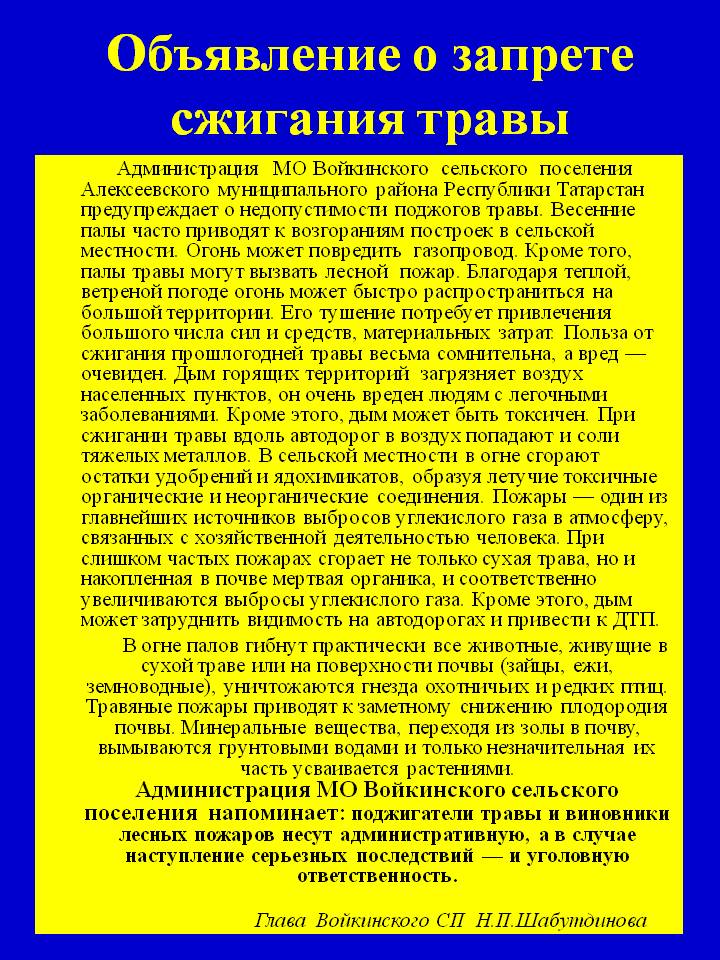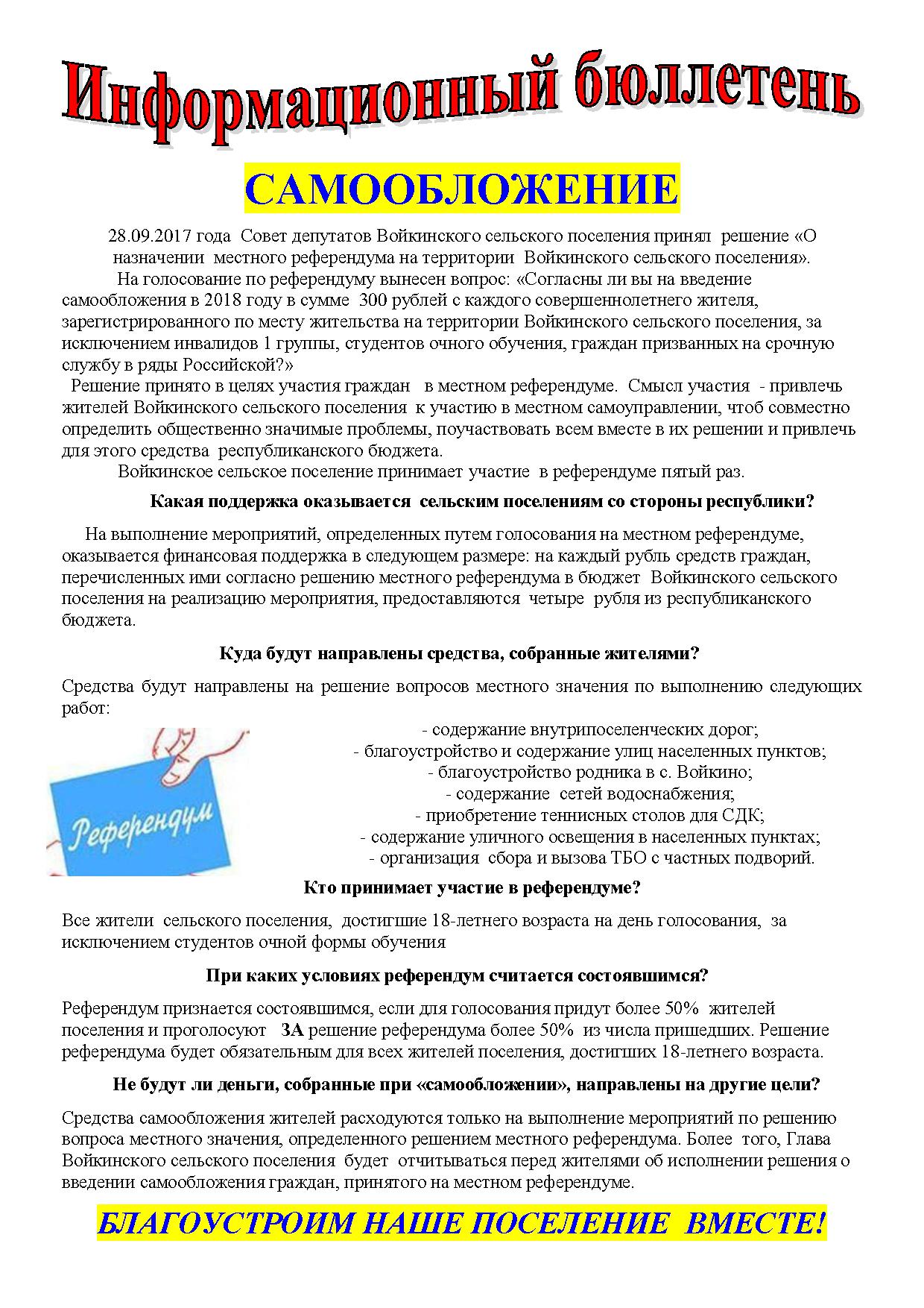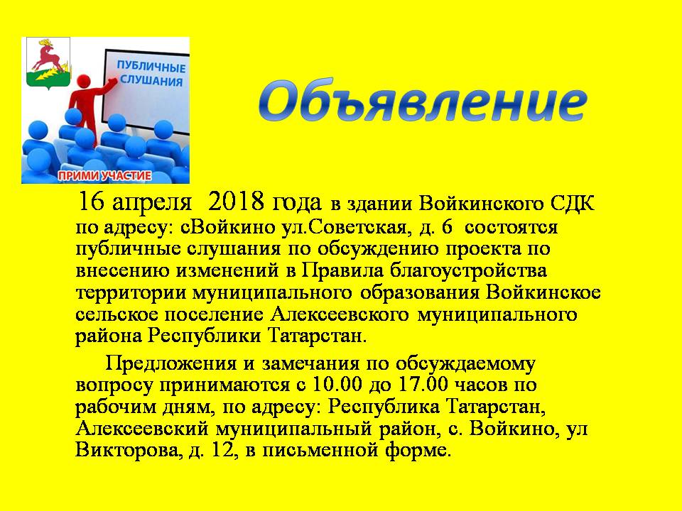 29 мая 2017 г. состоятся публичные слушания вздании Войкинского СДК в 10.00 по обсуждению проекта Правил благоустройства территории муниципального образования Войкинское сельское поселение Алексеевского муниципального района Республики Татарстан. Предложения к проекту принимаются с 10.00 до 17.00 часов по рабочим дням, по адресу: Республика Татарстан, Алексеевский муниципальный район, с.Войкино, улица Советская, д. 6, в письменной форме.