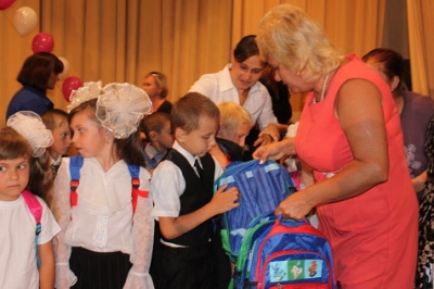 Хәйруллинның Хәйрия фонды вәкилләре балаларга зәңгәр һәм алсу төстәге портфельләр таратты.