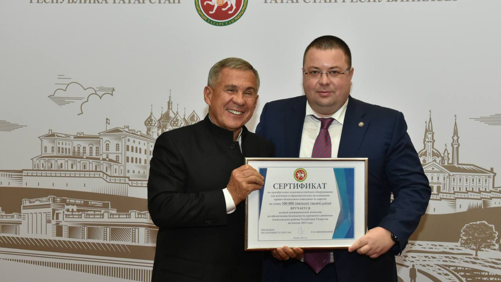 Татарстан Президенты Рөстәм Миңнеханов Сергей Демидовка белем бирү оешмаларында юлларда куркынычсызлык кагыйдәләрен өйрәнү өчен укыту җиһазлары сатып алу өчен 500 мең сумлык сертификат тапшырды.